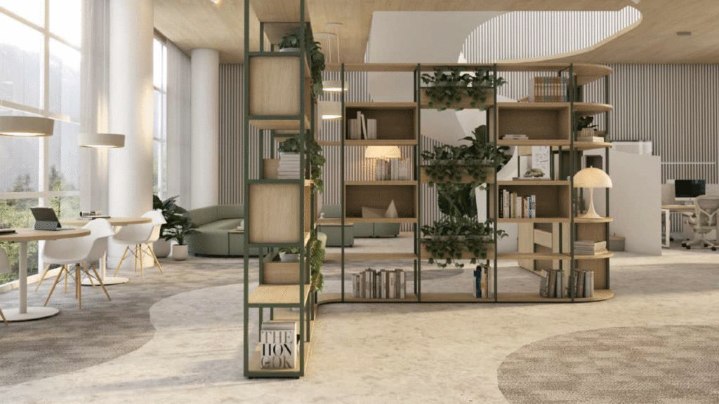 O mobiliário pode ser projetado para incorporar elementos naturais, como estantes e divisórias com espaços para plantas, jardins verticais integrados a estações de trabalho e mesas com suportes para vegetação. Além de melhorar a qualidade do ar, essa abordagem cria um ambiente dinâmico e visualmente mais agradável.
